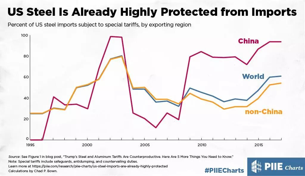 中国WRO起诉美国对中国钢铁无缝管等加征关税!接连两天,中国在世贸组织(WTO)连续“提告”美国。 继在世贸组织(WTO)起诉美国301征税建议措施后,中国在WTO又发一招:4月5日,中国就美国进口钢铁和铝产品232措施,在WTO争端解决机制项下向美方提出磋商请求,正式启动争端解决程序。 商务部条约法律司负责人就此表示:美国232措施名为维护“国家安全”,实为实施贸易保护主义。美方一方面选择性地排除部分国家和地区,另一方面对包括中国在内的部分世贸成员实施了征税措施。 商务部条约法律司负责人指出,美方的这种做法严重违反多边贸易体制的非歧视原则,严重违反其在世贸组织项下的关税减让承诺和有关保障措施的规则和纪律,损害了中国作为世贸组织成员的正当权益。 此前,中国国务院关税税则委员会决定自2018年4月2日起对自美进口的128项产品加征15%或25%的关税。 在随后公布的《对美中止关税减让义务清单及加征关税税率》显示,冷轧的钢铁制无缝锅炉管、其他不锈钢制钻管等部分钢铁产品加征15%的关税。在美方对进口钢铁和铝产品采取232措施的情况下,此举旨在平衡其对中方造成的利益损失。 清华大学中美关系研究中心高级研究员周世俭对第一财经记者表示,钢铁贸易一直都是美方对华“双反”调查重点目标,为此,美国企业很长时间以来都用不上中国价廉物美的好钢材了,目前中国钢铁出口最大的目的地还是在亚洲区域。 中国率先在WTO起诉 对于中国在WTO起诉美国232措施的举措,商务部条约法律司负责人指出,鉴于美方拒绝根据WTO规则与中方进行补偿谈判,中方不得不启动争端解决程序,捍卫合法权益。 目前,中方是对美方“232措施”第一个做出关税回应的国家,也是率先在WTO起诉美国232措施的国家。 在特朗普政府以国家安全为名实行“232调查”,并决定对进口钢征收25%的关税,对进口铝征收10%的关税后,不少国家扬言对美进行反制,其中欧盟更是第一时间拿出了列满超过100件美国产品、价值超过28亿美元的贸易报复清单,其中美国钢铁产品和农产品均将“中招”。 3月23日,在WTO货物贸易理事会会议上,美国因进行“232调查”遭到40余个WTO成员国的质疑。包括欧盟28个成员国在内的40多个WTO成员警告美国开征进口钢铝税不仅影响贸易商业利益,还将影响WTO多边贸易系统的稳定性和可预见性。俄罗斯代表则指出,目前有多个WTO成员已经得到豁免,美方需要对豁免本身做出澄清,且澄清这些措施是如何在WTO规则之下成立的。 随后,美方根据“亲疏远近”关系,对自己的盟友国家给予了不同的豁免待遇,其中加拿大和墨西哥的豁免待遇将同《北美自由贸易协定》重谈结果挂钩,此外欧盟、巴西等国家和地区则得到了在5月1日之前的豁免待遇。 中美此前也在WTO就“232措施”进行了协商。中国商务部在网站刊登的商务部新闻发言人声明中透露了中美协商“232措施”过程中的细节。 中方认为,美方对进口钢铁和铝产品采取“232措施”,滥用WTO“安全例外”条款,实质上构成保障措施,而且其措施仅针对少数国家,严重违反了作为多边贸易体制基石的非歧视原则,严重侵犯中方利益。 3月26日,中方根据《保障措施协定》在WTO向美方提出贸易补偿磋商请求,美方拒绝答复。 鉴于双方没有达成一致的可能,3月29日,中方向WTO通报了中止减让清单,决定对自美进口部分产品加征关税,以平衡美方“232措施”对中方造成的利益损失。 中国商务部发言人指出,中方对美方中止履行部分义务是中国作为WTO成员的正当权利。希望美方尽快撤销违反WTO规则的措施,使中美双方间有关产品的贸易回归到正常轨道。 此前,包括美国共和党在内的许多利益攸关方都在力劝特朗普不要使用在历史上已经验证过并不奏效且违反WTO规则的上述钢铝关税。各方并指出,2002年,小布什政府以反对向美国倾销钢铁为由,大幅提高了对进口钢铁产品的关税,不过在2003年,迫于全球贸易伙伴和国内钢铁消费业的压力,布什宣布取消该惩罚性钢铁关税;同时WTO也做出判决,表示根据全球贸易法则,美国征收惩罚性钢铁关税是非法的。 稍后根据一项美方研究更显示,仅一年内,美方出台的惩罚性关税造成了其他行业共20万人失业,而这一人数比当时美国钢铁工人的总数还要高,同时对于那些使用钢铁的制造商而言,这一惩罚性关税造成了40亿美元的损失。 钢铁贸易成为近年来中美贸易摩擦重灾区 实际上,由于美国国内在钢铁方面的贸易保护主义措施,钢铁贸易已成为近年来中美贸易摩擦的重灾区。 即便在对钢铁进行“232调查之前,美国已对十几类产品采取了几十项反倾销、反补贴措施,涵盖几乎所有大类钢铁产品,且税率幅度之高近乎禁止性关税。 彼得森国际经济研究所(PIIE)高级研究员鲍恩(Chad Bown)在其《美国钢铁已受到高度保护》的一篇文章中写道,数十年来,美国钢铁行业一直是进口特殊保护的最大受益者:截至2017年底,超过60%的进口钢材的都受到关税影响。这些特殊限制措施约覆盖了94%的从中国进口的钢材。 美国钢铁已经受到进口保护图 其中94%中国对美出口钢铁都遭受了贸易保护措施(来源:PIIE ) 鲍恩(Chad Bown)指出,目前中国对美出口钢材仅占美国进口钢材总量的3%。 而在此次另一份“232调查”涉及的铝产品方面,鲍恩(Chad Bown)并指出,自2009年开始,美国政府则开始了对美国铝业的贸易保护,且针对中国